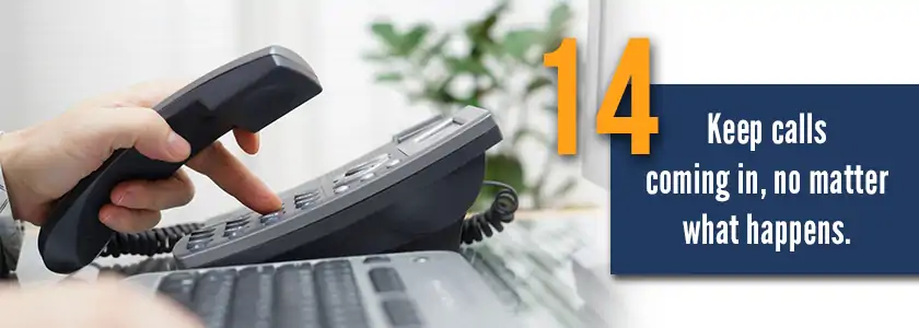 If your office needs to be closed for any reason (emergency, weather, power outage), the remote answering service keeps working. Even when the unexpected happens, your company is still “open for business” — or sounds that way to all callers — and you don’t have to worry about missing any calls.